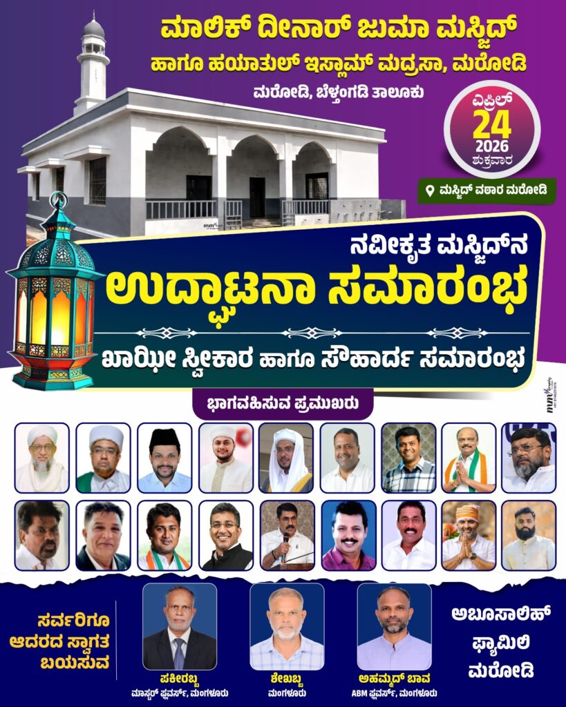 ‌ ಬೆಳ್ತಂಗಡಿ ತಾಲೂಕು ಮರೋಡಿಯ ಮಾಲಿಕ್ ದೀನಾರ್ ಜುಮ್ಮಾ ಮಸೀದಿಯ ನವೀಕೃತ ಕಟ್ಟಡ ಉದ್ಘಾಟನೆ ಹಾಗೂ ಖಾಝಿ‌ ಸ್ವೀಕಾರ‌ ಸಮಾರಂಭವು ನಾಳೆ ( ಶುಕ್ರವಾರ) ನಡೆಯಲಿದೆ.